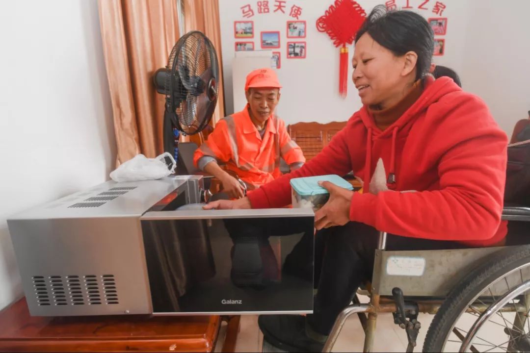1月9日,在龙岩市新罗区一处环卫工人爱心服务点,董锦香为董基东热饭菜。
