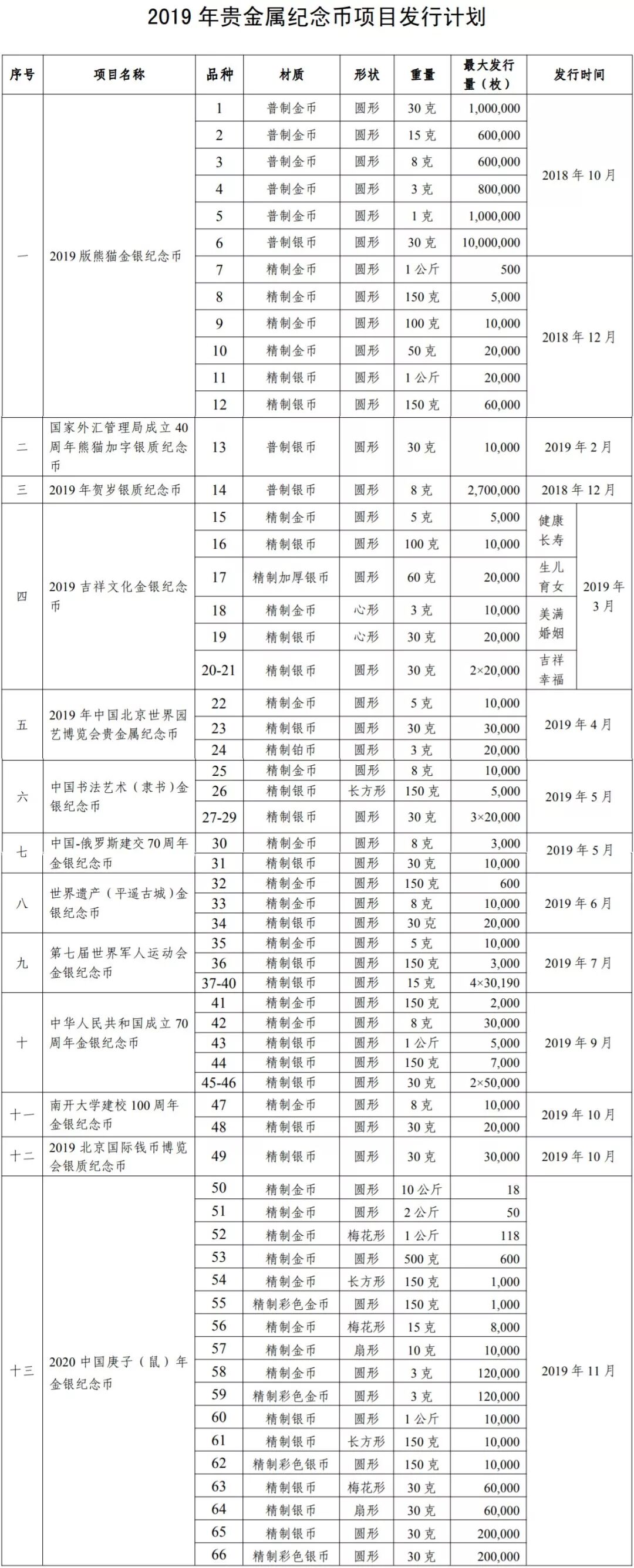 中国人民银行2019年贵金属纪念币项目发行计划共包括13个项目,66个品种。